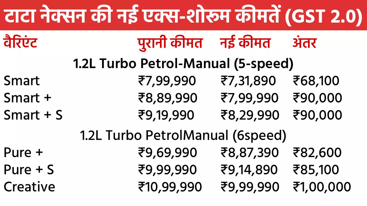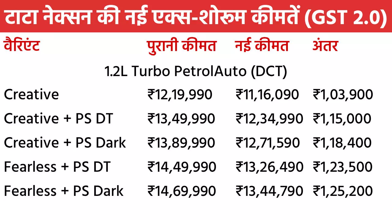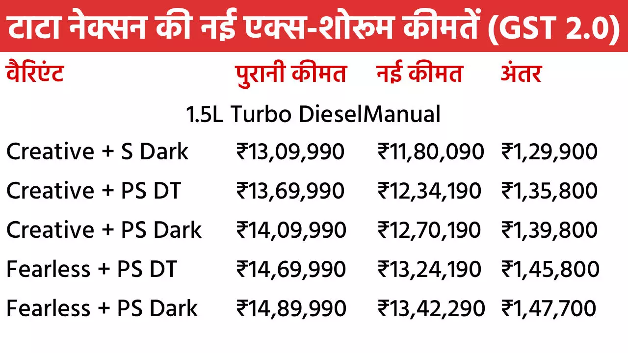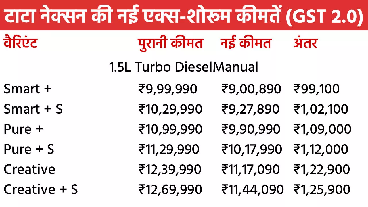 Tata Nexon Diwali Discount in October 2025: टाटा मोटर्स अपनी नंबर-1 कार नेक्सन पर शानदार दिवाली डिस्काउंट दे रही है। इस महीने ये SUV खरीदने पर पूरे 2 लाख रुपए तक के फायदे मिलेंगे। नेक्सन पर मिलने वाले इस बेनिफिट में नए GST 2.0 से इसकी कीमत में 1.55 लाख रुपए की टैक्स कटौती भी शामिल है। इसके साथ कंपनी 45 हजार रुपए तक के दूसरे बेनिफिट भी मिलेंगे। इसमें कैश डिस्काउंट, स्क्रैपेज ऑफर और कॉर्पोरेट डील्स शामिल हैं। सितंबर में नेक्सन को सबसे ज्यादा खरीदा गया। चलिए नेक्सन के सभी वैरिएंट की नई एक्स-शोरूम कीमतों पर नजर डालते हैं।