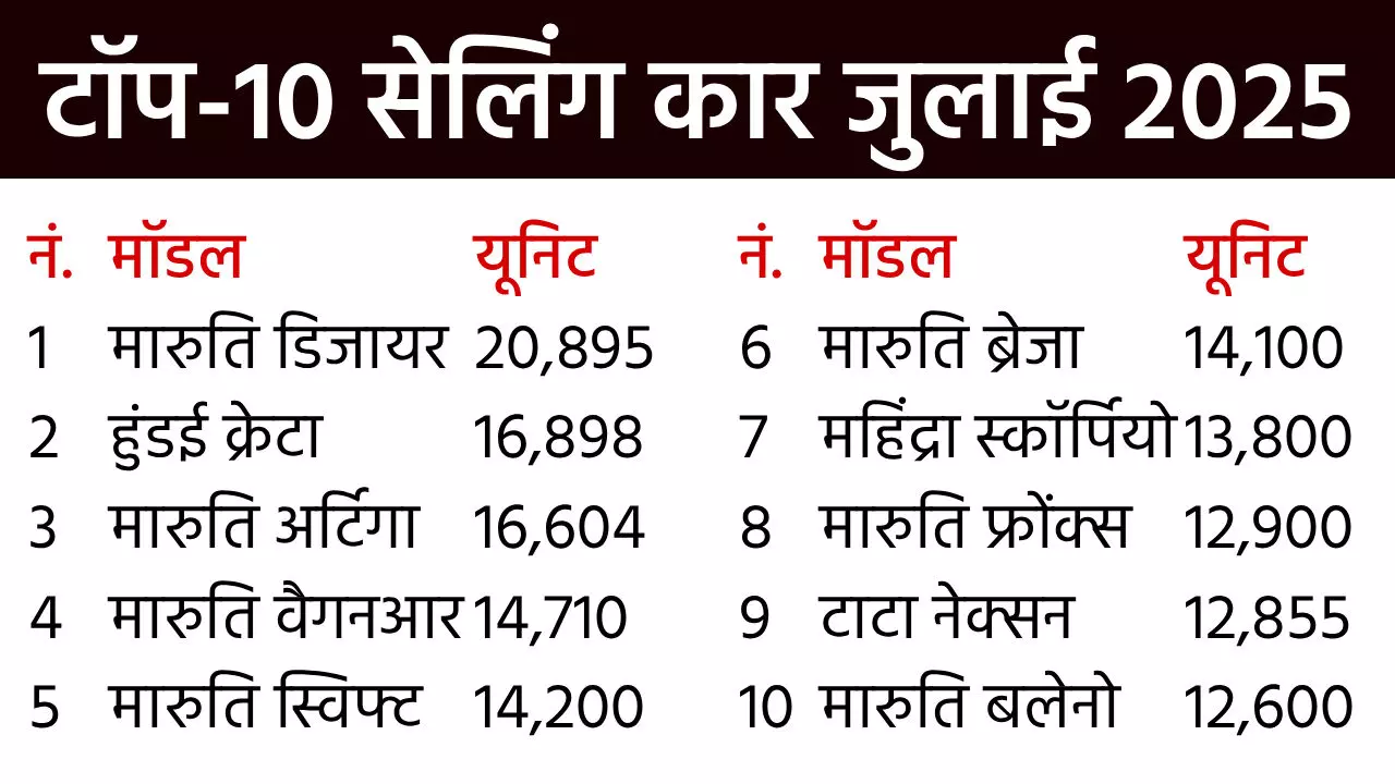 जुलाई की टॉप-10 कारों की बात करें तो इसमें सबसे ज्यादा मारुति सुजुकी के 7 मॉडल शामिल रहे। वहीं, हुंडई, महिंद्रा और टाटा के 1-1 मॉडल के जगह मिली। मारुति सुजुकी डिजायर की 20,895 यूनिट, हुंडई क्रेटा की 16,898 यूनिट, मारुति सुजुकी अर्टिगा की 16,604 यूनिट, मारुति सुजुकी गनआर की 14,710 यूनिट, मारुति सुजुकी स्विफ्ट की 14,200 यूनिट, मारुति सुजुकी ब्रेजा की 14,100 यूनिट, महिंद्रा स्कॉर्पियो की 13,800 यूनिट, मारुति सुजुकी फ्रोंक्स की 12,900 यूनिट, टाटा नेक्सन की 12,855 यूनिट और मारुति सुजुकी बलेनो की 12,600 यूनिट बिकीं। इस लिस्ट से टाटा पंच हर रही।