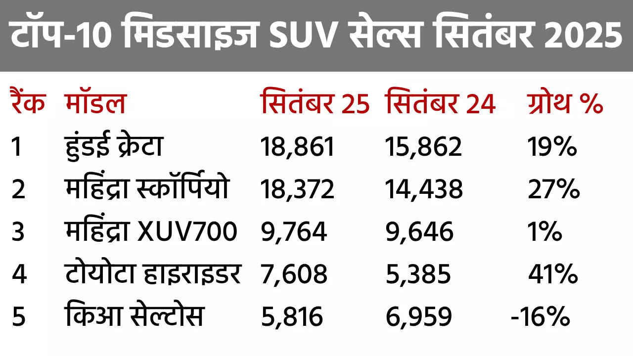 देश के मिडसाइज SUV के टॉप-10 मॉडल की बात करें तो इसमें पहले नंबर पर हुंडई क्रेटा रही। सितंबर में इसकी 18,861 यूनिट बिकीं। जबकि सितंबर 2024 में इसकी 15,862 यूनिट बिकी थीं। यानी इसे 19% की ग्रोथ मिली। दूसरे नंबर पर महिंद्रा स्कॉर्पियो रही। सितंबर में इसकी 18,372 यूनिट बिकीं। जबकि सितंबर 14,438 यूनिट बिकी थीं। यानी इसे 27% की ग्रोथ मिली। तीसरे नंबर पर महिंद्रा XUV700 रही। सितंबर में इसकी 9,764 यूनिट बिकीं। जबकि सितंबर 9,646 यूनिट बिकी थीं। यानी इसे 1% की ग्रोथ मिली।