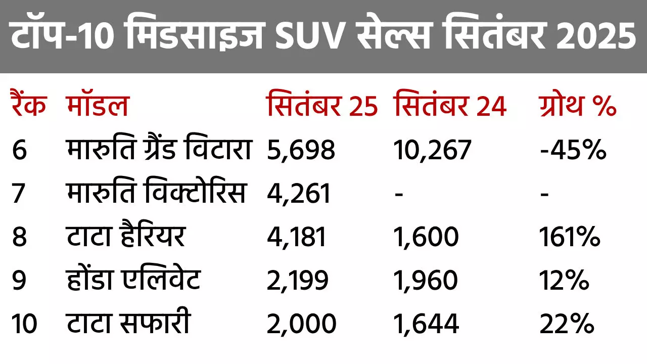 सातवें नंबर पर मारुति विक्टोरिस रही। सितंबर में इसकी 4,261 यूनिट बिकीं। आठवें नंबर पर टाटा हैरियर रही। सितंबर में इसकी 4,181 यूनिट बिकीं। जबकि सितंबर 1,600 यूनिट बिकी थीं। यानी इसे 161% की ग्रोथ मिली। नौवें नंबर पर होंडा एलिवेट रही। सितंबर में इसकी 2,199 यूनिट बिकीं। जबकि सितंबर 1,960 यूनिट बिकी थीं। यानी इसे 12% की ग्रोथ मिली। दसवें नंबर पर टाटा सफारी रही। सितंबर में इसकी 2,000 यूनिट बिकीं। जबकि सितंबर 1,644 यूनिट बिकी थीं। यानी इसे 22% की ग्रोथ मिली।