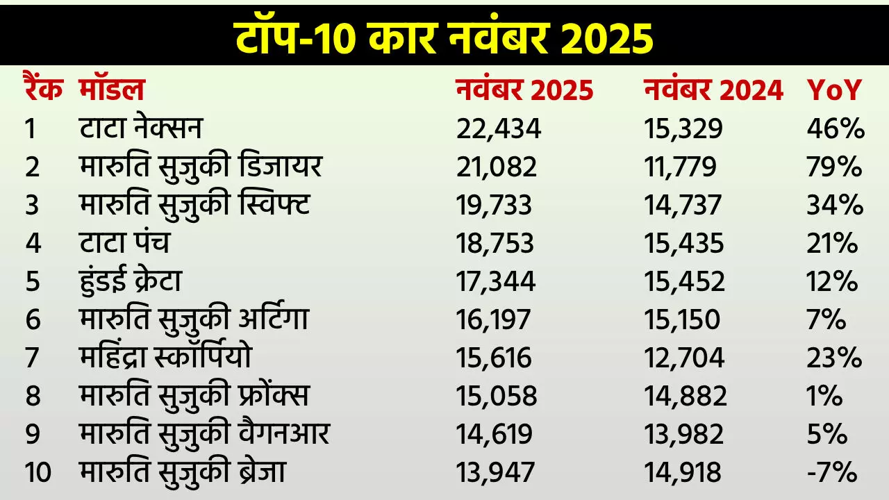 टाटा नेक्सन नंबर-1 पोजीशन पर रही। नवंबर 2025 में इसकी 22,434 यूनिट बिकीं। वहीं, नवंबर 2024 में इसकी 15,329 यूनिट बिकी थीं। यानी इसे 46% की सालाना ग्रोथ मिली। मारुति सुजुकी डिजायर नंबर-2 पोजीशन पर रही। नवंबर 2025 में इसकी 21,082 यूनिट बिकीं। वहीं, नवंबर 2024 में इसकी 11,779 यूनिट बिकी थीं। यानी इसे 79% की सालाना ग्रोथ मिली।