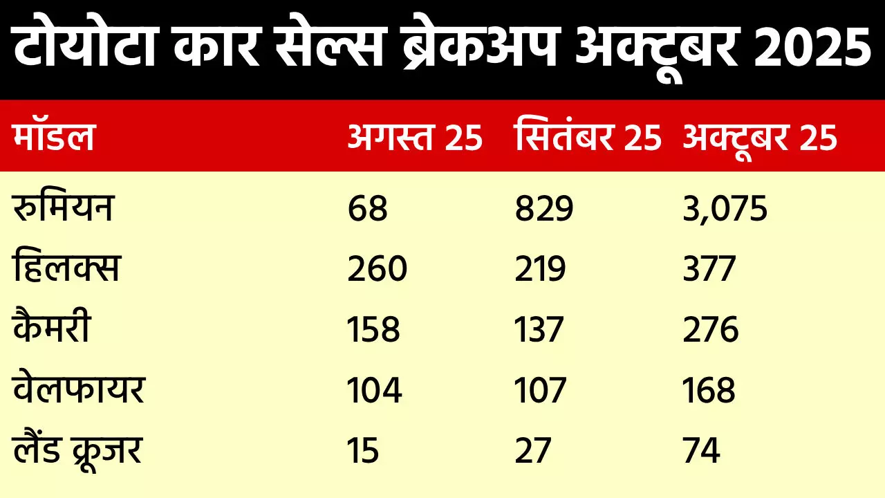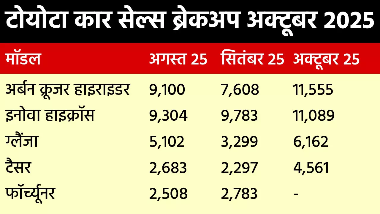 Toyota Sales Breakup October 2025: टोयोटा भारतीय बाजार में कुल 10 मॉडल बेच रही है। अक्टूबर में उसके लिए अर्बन क्रूजर हाइराइडर सबसे ज्यादा बिकने वाली कार रही। इसने अक्टूबर में अपनी इस साल की सबसे बड़ी सेल दर्ज की है। इसे 11,555 ग्राहक मिले। खास बात ये है कि सितंबर की तुलना में कंपनी के सभी मॉडल को ग्रोथ मिली है। बता दें कि कंपनी भारतीय बाजार में अर्बन क्रूजर हाइराइडर, इनोवा हाइक्रॉस, ग्लैंजा, टैसर, फॉर्च्यूनर, रुमियन, हिलक्स, कैमरी, वेलफायर और लैंड क्रूजर को बेचती है। चलिए इसका सेल्स ब्रेकअप देखें।