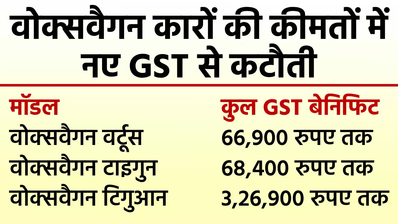 Volkswagen Taigun, Virtus and Tiguan Price: नई GST दरों की घोषणा के बाद भारत में पॉपुलर कार कंपनियां अपने मॉडलों की नई कीमतों या कीमतों में कटौती की डिटेल शेयर कर रही है। हुंडई, टाटा, महिंद्रा, किआ और स्कोडा पहले ही कीमतों में कटौती का खुलासा कर चुके हैं। ऐसे में अब वोक्सवैगन ने भी अपनी कारों की कीमतों में अधिकतम कटौती का खुलासा कर दिया है। जर्मन कार निर्माता ने साफ किया है कि 22 सितंबर से जब नए GST नियम लागू होंगे। जिसके बाद उसकी वर्टूस, टाइगुन और टिगुआन आर-लाइन की कीमतों में भारी कटौती हो जाएगी।