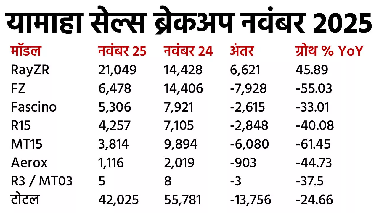 यामाहा मोटर इंडिया की बीते महीने की सेल्स ब्रेकअप सामने आ गया है। नवंबर 2025 में इसे बुरी गिरावट का सामना करना पड़ा।