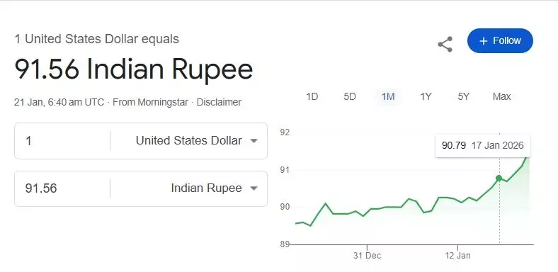 डॉलर के मुकाबले भारतीय रुपया 91.56 के नए रिकॉर्ड निचले स्तर पर पहुंच गया है।