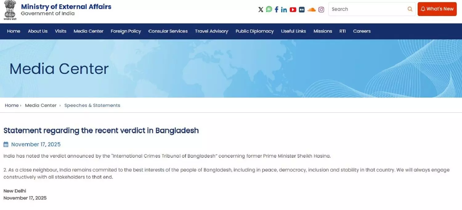 “भारत ने ‘बांग्लादेश के अंतरराष्ट्रीय अपराध न्यायाधिकरण’ द्वारा पूर्व प्रधानमंत्री शेख हसीना के खिलाफ सुनाए गए फैसले पर संज्ञान लिया है। एक घनिष्ठ पड़ोसी के रूप में भारत बांग्लादेश के नागरिकों के सर्वोत्तम हितों के प्रति प्रतिबद्ध है, जिसमें उस देश में शांति, लोकतंत्र, समावेशिता और स्थिरता को बढ़ावा देना शामिल है। हम इस दिशा में सभी संबंधित पक्षों के साथ निरंतर रचनात्मक सहयोग बनाए रखेंगे।”