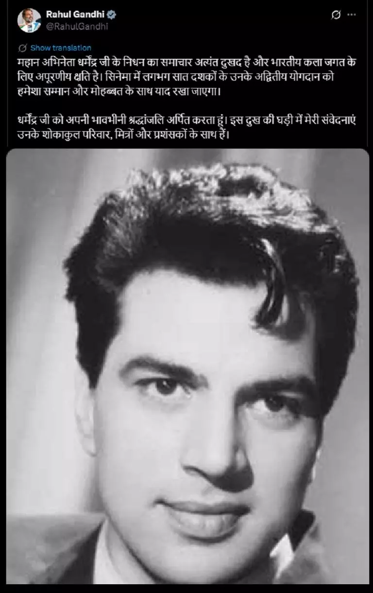 राहुल गांधी ने धर्मेंद्र के निधन पर जताया शोक