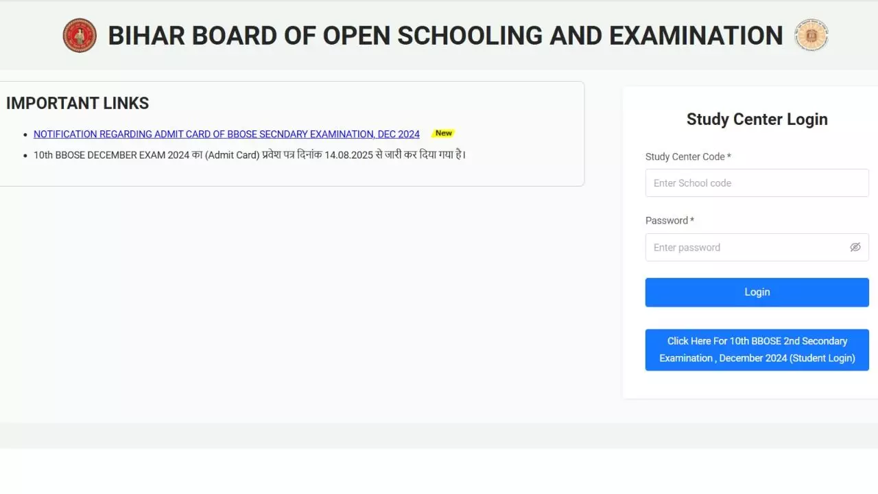 BBOSE admit card 2025OUT: बिहार बोर्ड ऑफ ओपन स्कूलिंग एंड एग्जामिनेशन (BBOSE) ने कक्षा 10 और 12 की ओपन स्कूल परीक्षाओं के लिए एडमिट कार्ड 14 अगस्त 2025 को जारी कर दिए हैं। परीक्षा में शामिल होने वाले छात्र अपने स्टडी सेंटर कोऑर्डिनेटर के जरिए हॉल टिकट प्राप्त कर सकते हैं।