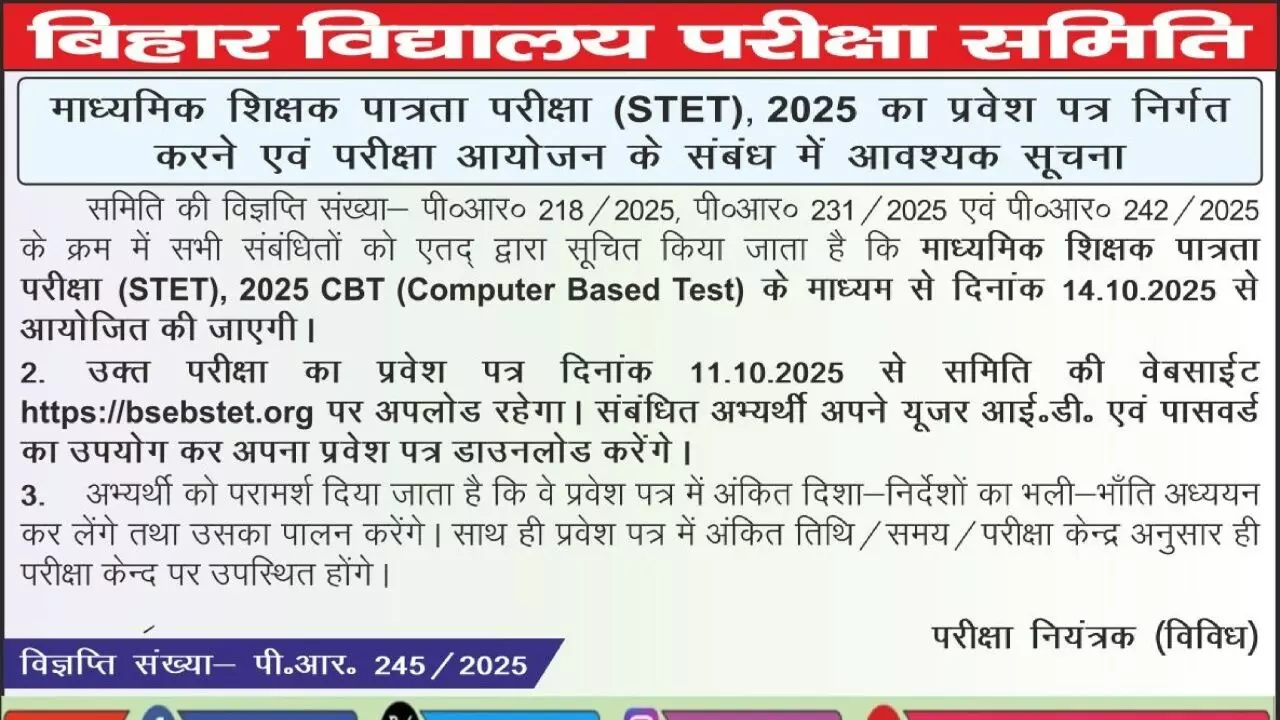 Bihar STET Admit Card: बिहार स्कूल एग्जामिनेशन बोर्ड (BSEB) ने Bihar STET Admit Card 2025 जारी करने की तारीख घोषित कर दी है। उम्मीदवार 11 अक्टूबर 2025 से अपना एडमिट कार्ड आधिकारिक वेबसाइट bihar-stet.com से डाउनलोड कर सकेंगे।