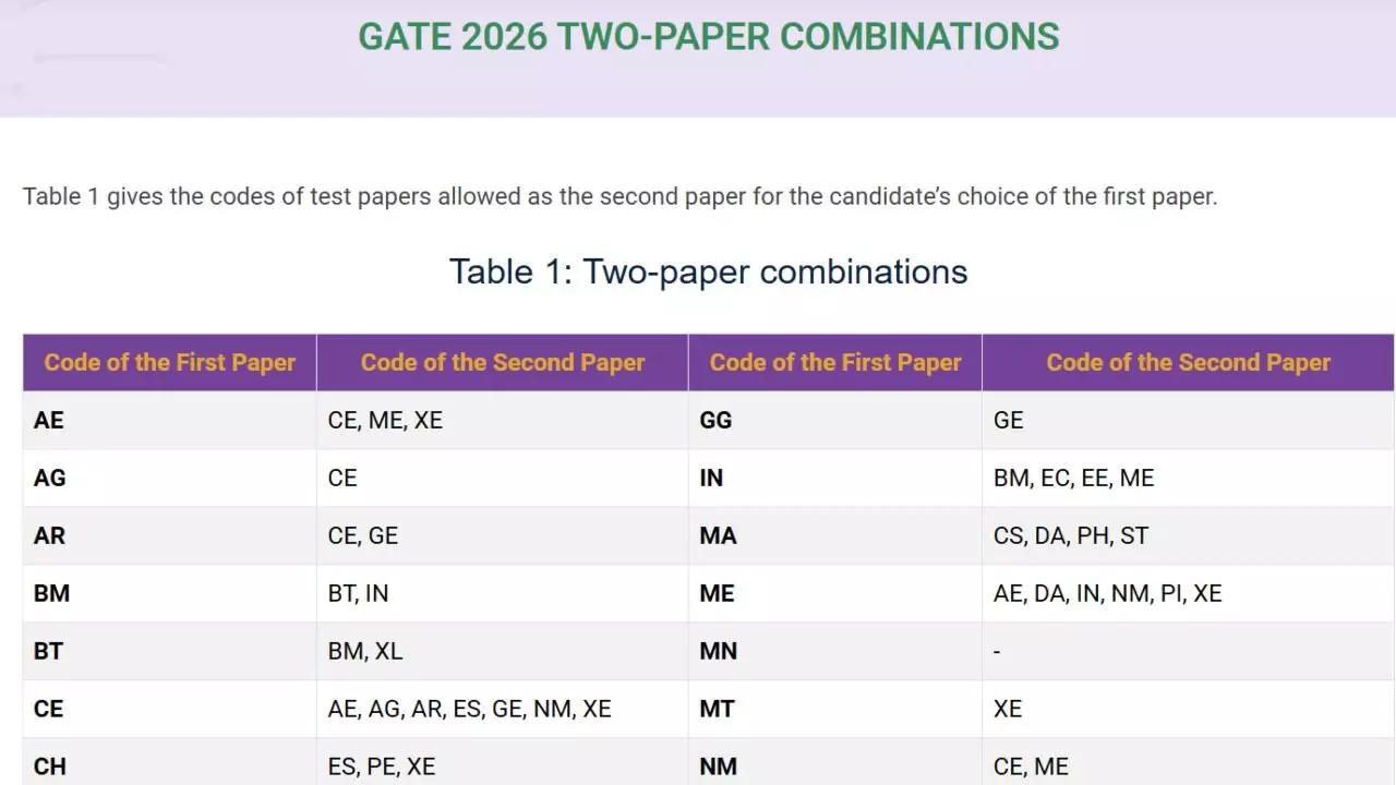 दो-पेपर विकल्प चुनने वाले उम्मीदवारों को पहले एक मुख्य पेपर चुनना होगा, और दूसरा पेपर IIT गुवाहाटी द्वारा स्वीकृत संयोजनों में से ही चुनना होगा। आवेदन विंडो के दौरान इस सूची से बाहर का कोई संयोजन स्वीकार नहीं किया जाएगा। हालांकि, आयोजन संस्थान ने कहा है कि बाद में लॉजिस्टिक्स की संभावना के आधार पर संयोजनों में वृद्धि की जा सकती है।