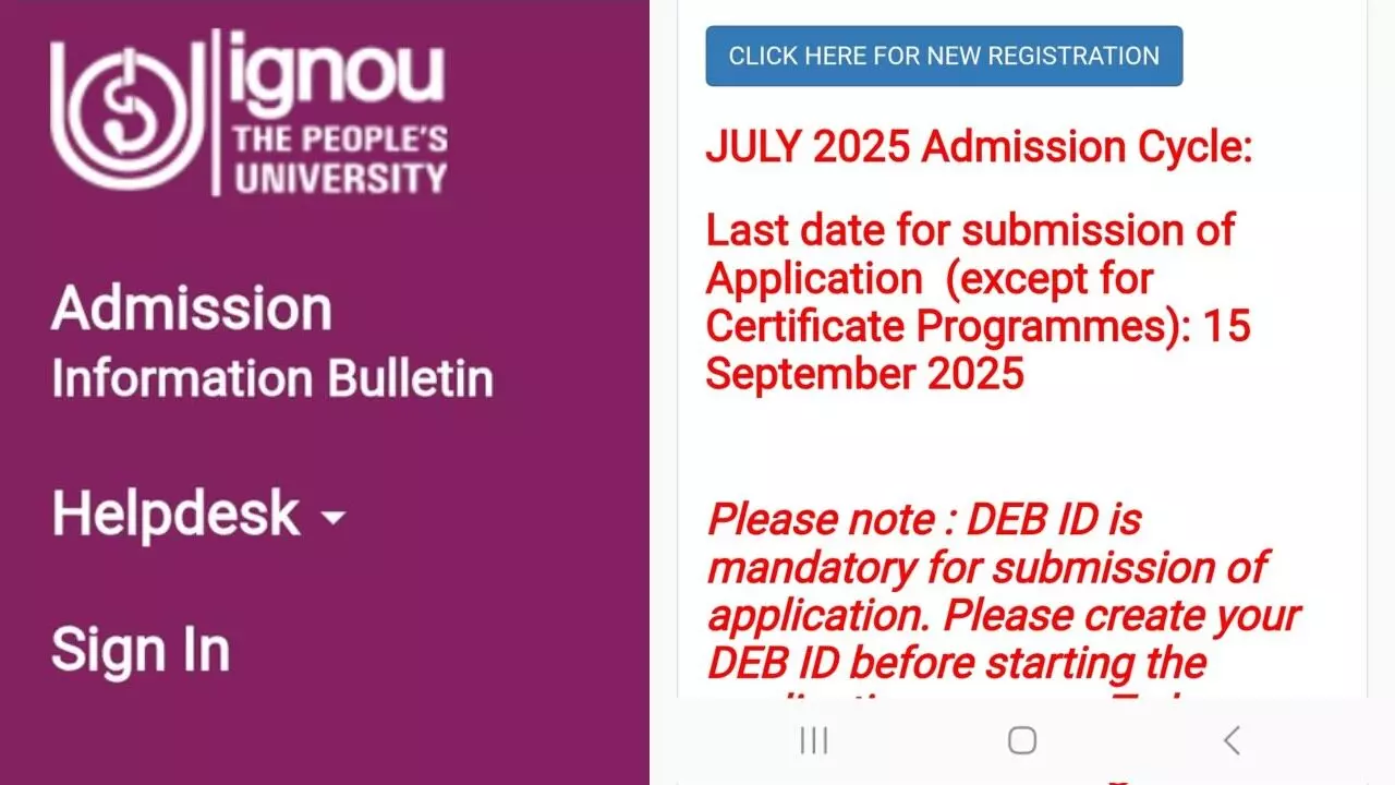 IGNOU Admission 2025: इंदिरा गांधी नेशनल ओपन यूनिवर्सिटी (IGNOU) ने जुलाई 2025 सेशन के लिए ऑनलाइन और डिस्टेंस लर्निंग (ODL) प्रोग्राम्स में दाखिले की आखिरी तारीख बढ़ा दी है। अब छात्र 15 सितंबर 2025 तक आवेदन कर सकते हैं। पहले यह डेडलाइन 31 अगस्त थी। छात्र IGNOU की ऑफिशियल वेबसाइट ignouadmission.samarth.edu.in या ignouiop.samarth.edu.in के जरिए ऑनलाइन आवेदन कर सकते हैं।