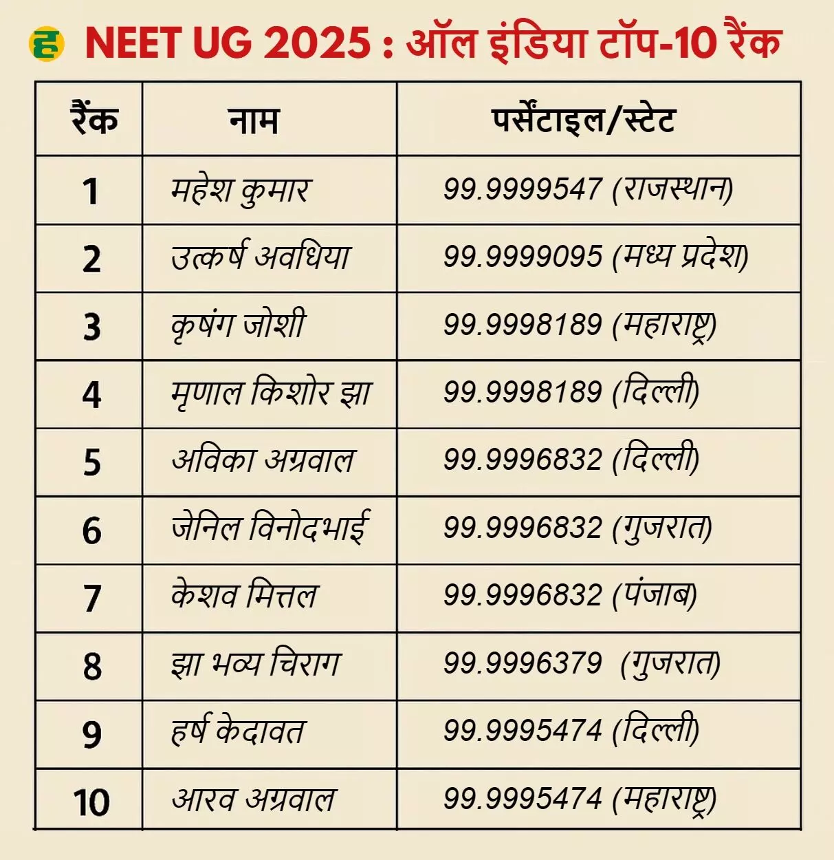 इस बार के टॉप 10 रैंकर्स में राजस्थान के 4 छात्र शामिल हैं। इनमें से 3 छात्र कोटा से हैं, जो मेडिकल की कोचिंग के लिए प्रसिद्ध है।