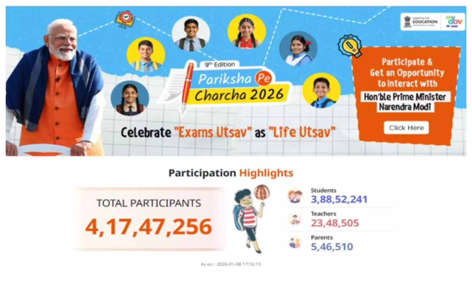 प्रधानमंत्री नरेंद्र मोदी द्वारा आयोजित वार्षिक संवाद कार्यक्रम परीक्षा पे चर्चा 2026 ने इस बार भागीदारी के सभी पुराने रिकॉर्ड तोड़ दिए हैं। 8 जनवरी तक जारी आंकड़ों के मुताबिक, इस कार्यक्रम के लिए अब तक कुल 4 करोड़ 17 लाख 47 हजार 256 लोगों ने पंजीकरण कराया है। यह आंकड़ा बीते वर्षों की तुलना में सबसे अधिक है, जिससे कार्यक्रम की लोकप्रियता और बढ़ते भरोसे का साफ संकेत मिलता है।