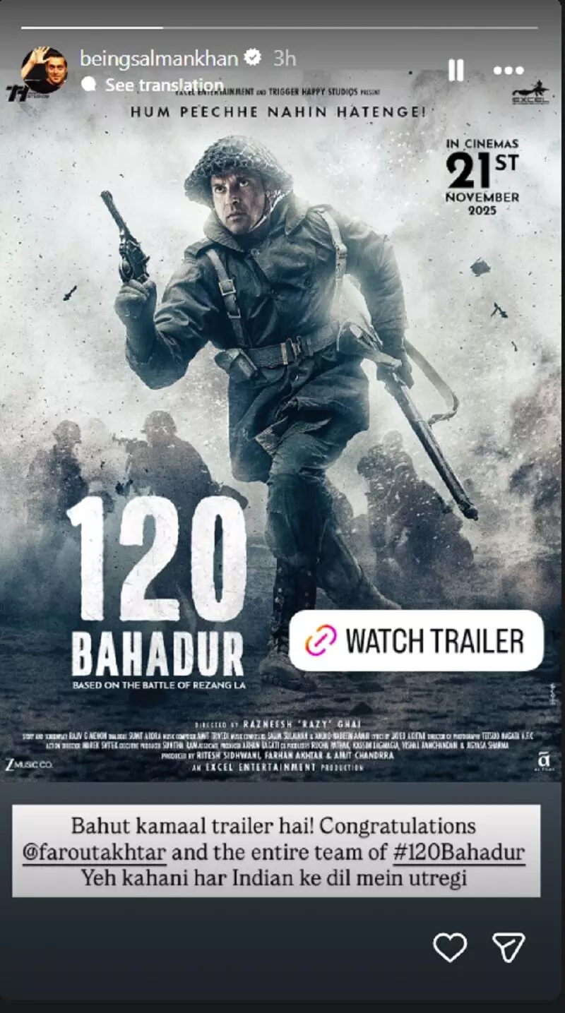 ट्रेलर रिलीज़ के कुछ ही घंटों बाद बॉलीवुड सुपरस्टार सलमान खान ने फरहान की फिल्म की तारीफ की है। उन्होंने 120 बहादुर का ट्रेलर अपने इंस्टाग्राम स्टोरी पर शेयर करते हुए लिखा- “बहुत कमाल ट्रेलर है। फरहान अख्तर और पूरी टीम को बधाई। 120 बहादुर- ये कहानी हर भारतीय के दिल में उतरेगी।”
