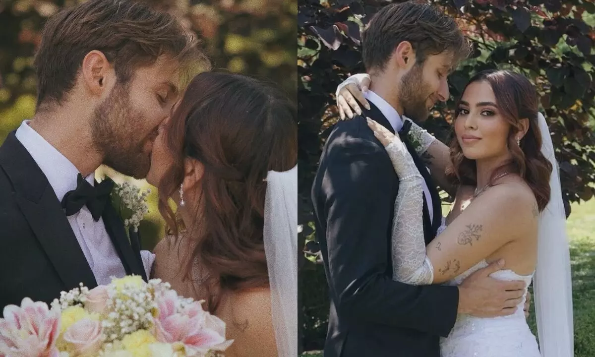 इन तस्वीरों में आलिया सफेद ऑफ-शोल्डर वेडिंग ड्रेस और लेस ग्लव्स में घूंघट के साथ नजर आ रही हैं। उन्होंने अपने बालों को हल्की वेव्स में स्टाइल किया है। वहीं, शेन ब्लैक टक्सीडो और बो टाई में दिखाई दे रहे हैं।