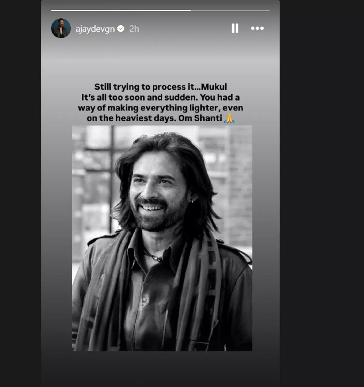 अजय देवगन ने इंस्टाग्राम पर मुकुल की एक ब्लैक एंड व्हाइट तस्वीर साझा करते हुए लिखा: "अभी भी समझ नहीं पा रहा हूं... मुकुल। ये सब बहुत जल्दी और अचानक हो गया। तुम हमेशा मुश्किल दिनों में भी चीजें आसान बना देते थे। ओम शांति।" बता दें, अजय देवगन ने मुकुल के साथ सन ऑफ सरदार में काम किया था।