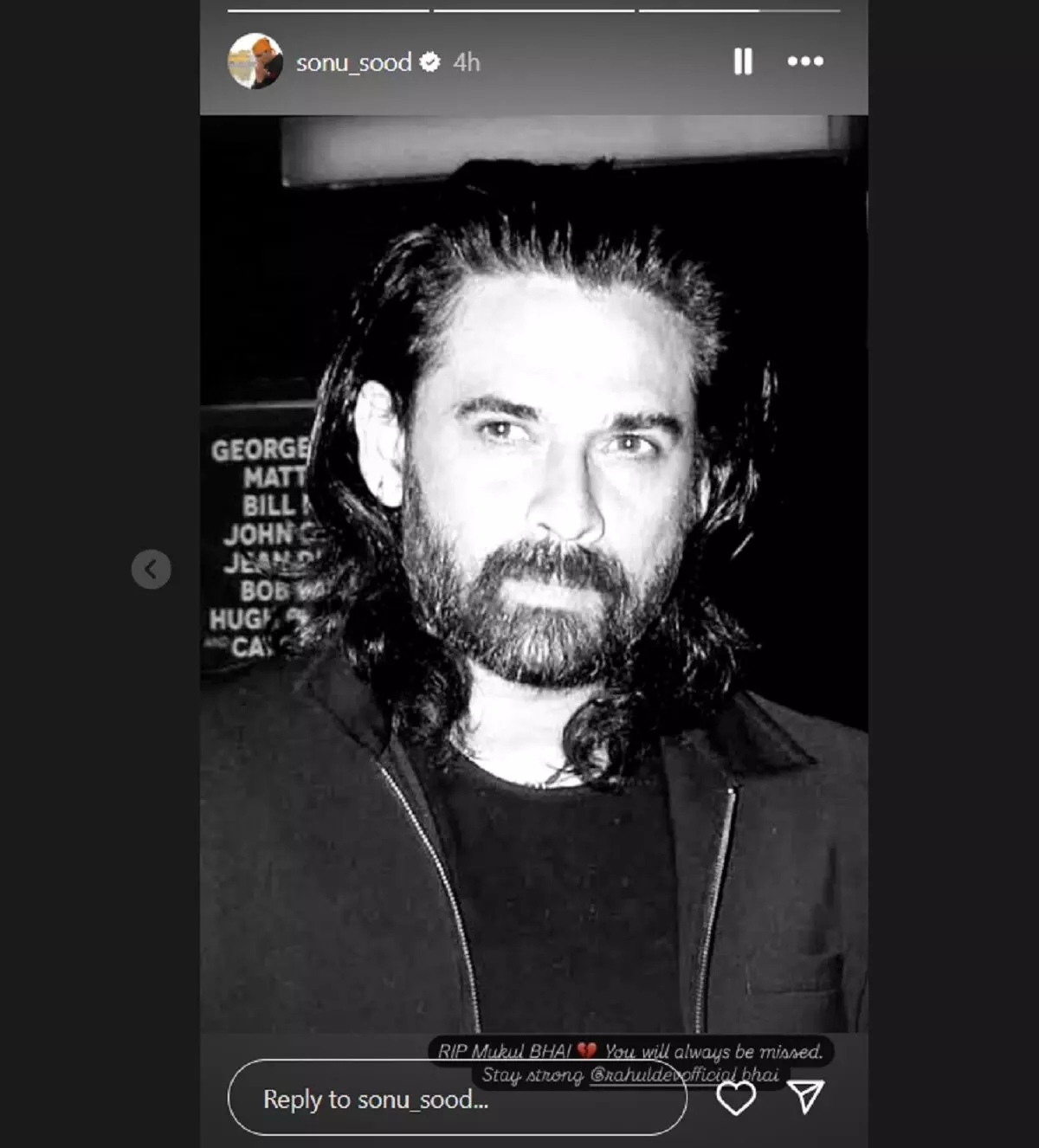 सोनू सूद ने लिखा: "आरआईपी मुकुल भाई। आप एक रत्न थे, हमेशा आपकी याद आएगी। मजबूत बने रहिए राहुल देव भाई।"