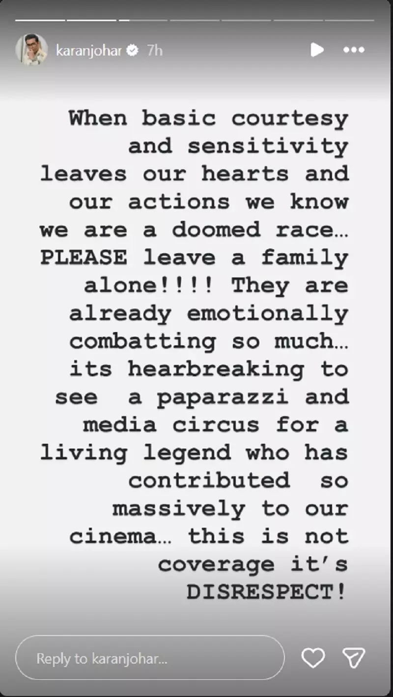 निर्देशक-निर्माता करण जौहर ने भी मीडिया के असंवेदनशील रवैये की आलोचना की। उन्होंने सोशल मीडिया पर लिखा, “जब हमारे दिलों और कर्मों से संवेदनशीलता और शालीनता खत्म हो जाती है, तो हम एक असंवेदनशील समाज बन जाते हैं। कृपया इस परिवार को अकेला छोड़ दें। वे पहले से ही भावनात्मक रूप से बहुत कुछ झेल रहे हैं। एक जीवित लेजेंड के इर्द-गिर्द मीडिया सर्कस बनाना सरासर असम्मान है!”