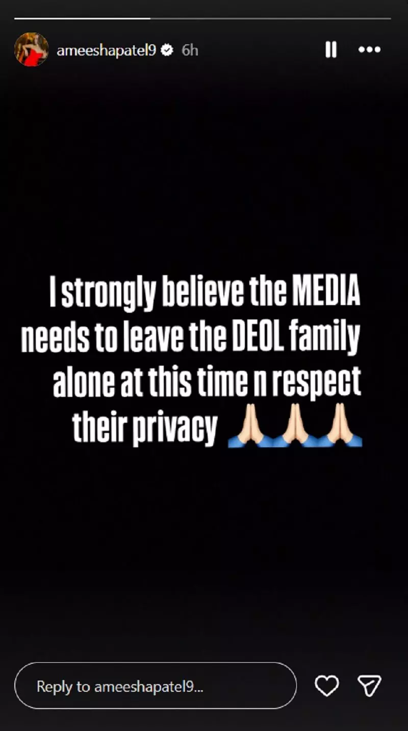 अभिनेत्री अमीषा पटेल, जिन्होंने धर्मेंद्र के बेटे सनी देओल के साथ ‘गदर’ फ्रैंचाइज़ में काम किया है, ने इंस्टाग्राम पर पोस्ट साझा करते हुए मीडिया से परिवार की निजता का सम्मान करने की अपील की।