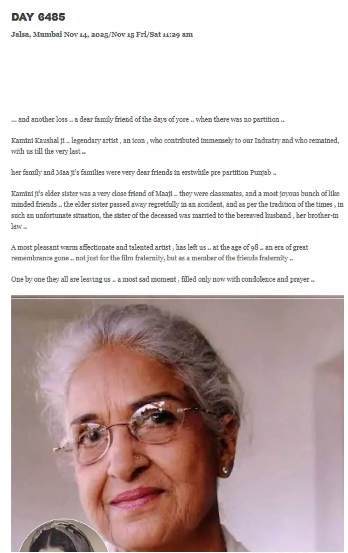 उन्होंने यह भी साझा किया कि कामिनी की बड़ी बहन उनकी मां की बहुत करीबी मित्र थीं। अमिताभ ने आगे लिखा, "कामिनी जी की बड़ी बहन मेरी मां की क्लासमेट थीं, और एक बहुत ही हंसमुख और समान विचारधारा वाले फ्रेंड सर्कल का हिस्सा थीं। उनकी बहन का दुखद रूप से एक हादसे में निधन हो गया था, और उस समय की परंपरा के अनुसार, मृतक की बहन का विवाह उनके जीजा से कर दिया गया।"