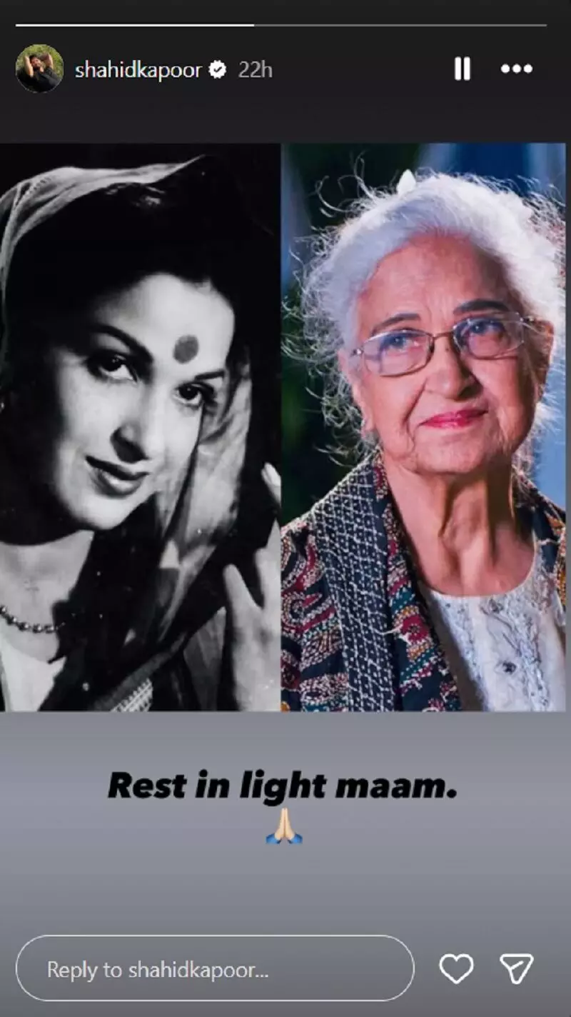 कामिनी कौशल के निधन पर कई बॉलीवुड सितारों ने सोशल मीडिया पर शोक व्यक्त किया। शाहिद कपूर, जिन्होंने 'कबीर सिंह' में उनके साथ काम किया, ने इंस्टाग्राम स्टोरी पर लिखा, "रेस्ट इन पीस मैम।"