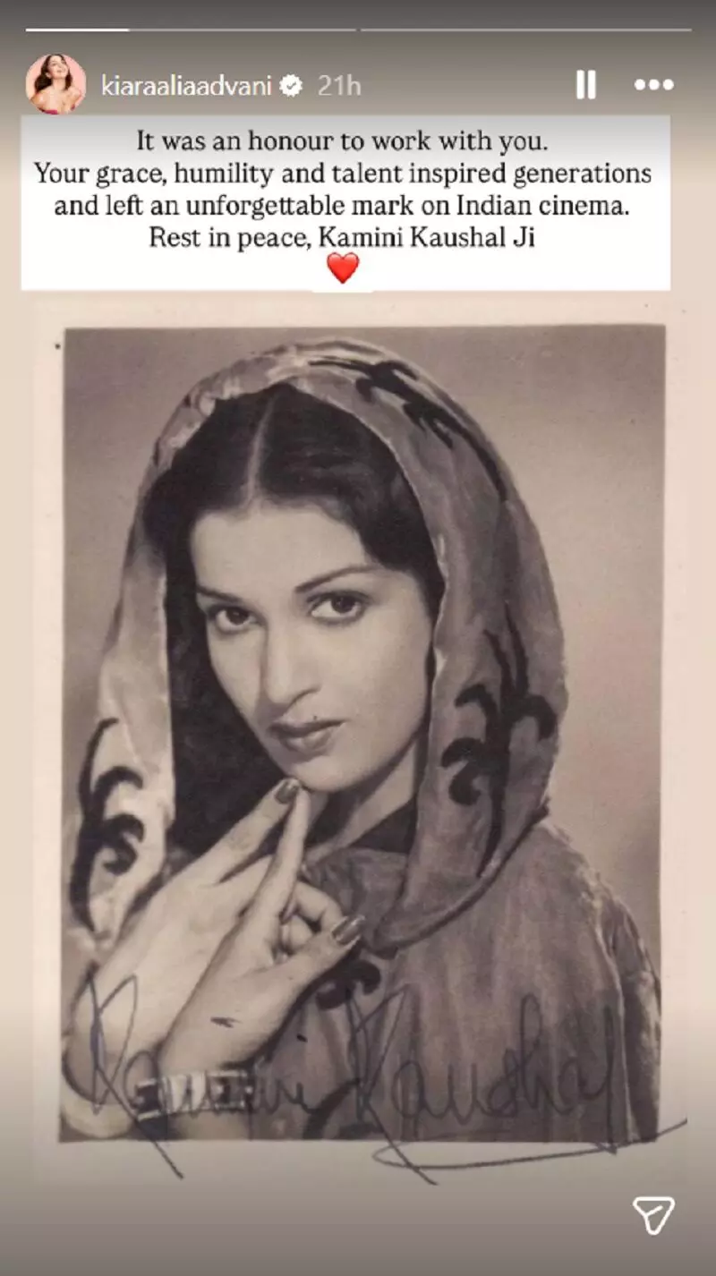 कियारा आडवाणी ने भी पोस्ट साझा करते हुए कहा, "आपके साथ काम करना मेरे लिए सम्मान की बात थी। आपकी शालीनता, विनम्रता और प्रतिभा ने कई पीढ़ियों को प्रेरित किया और भारतीय सिनेमा में अविस्मरणीय छाप छोड़ी। शांति से रहें, कमिनी कौशल जी।"