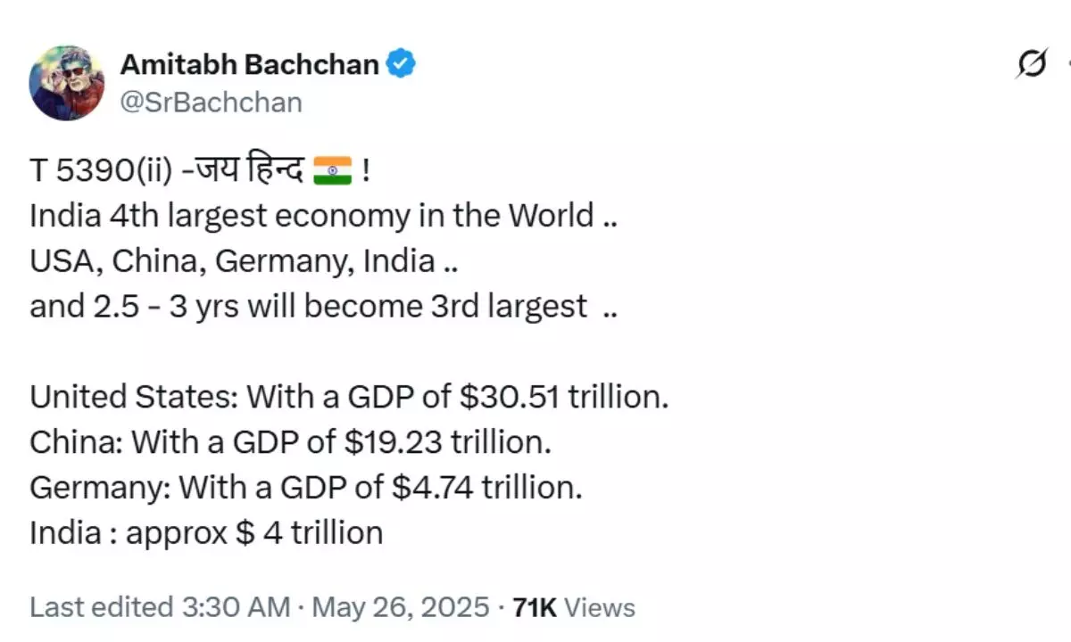 सोमवार 26 मई की सुबह अमिताभ बच्चन ने एक्स पर एक पोस्ट साझा करते हुए लिखा, "जय हिंद! भारत दुनिया की चौथी सबसे बड़ी अर्थव्यवस्था है… अमेरिका, चीन, जर्मनी, भारत… और अगले 2.5 से 3 वर्षों में यह तीसरे स्थान पर पहुंच जाएगा।" उन्होंने अमेरिका, चीन, जर्मनी और भारत की GDP के आंकड़े भी साझा किए –