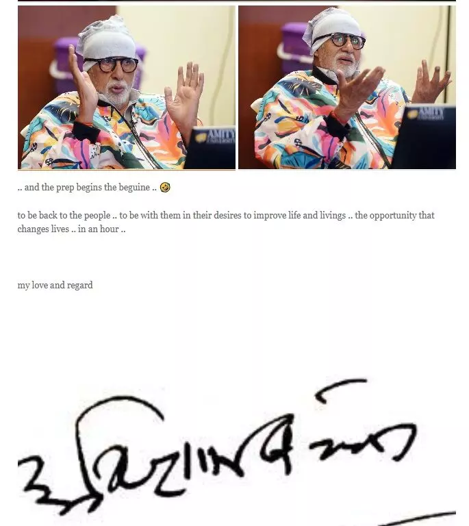 अमिताभ बच्चन ने बुधवार को अपने ब्लॉग पर कुछ तस्वीरें शेयर कीं, जिनमें वह शो के सेट पर कंप्यूटर के सामने बैठे नज़र आ रहे हैं और किसी से बातचीत कर रहे हैं। उन्होंने मल्टीकलर जैकेट, सफेद टोपी और चश्मा पहना हुआ है।