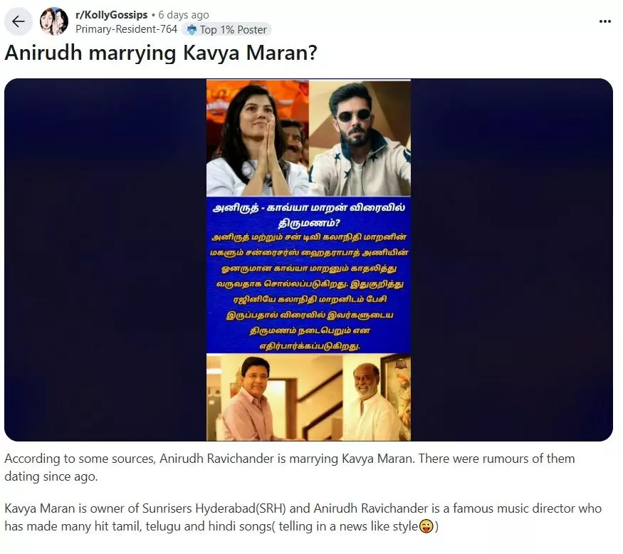 एक तमिल मीडिया रिपोर्ट के अनुसार, नेटिजियन्स का कहना है कि अनिरुद्ध और काव्या को कई बार डिनर डेट्स पर देखा गया है और वे एक साथ विदेश यात्रा पर भी जा चुके हैं। इन बातों ने दोनों के रिश्ते की अफवाहों को और हवा दे दी है।
