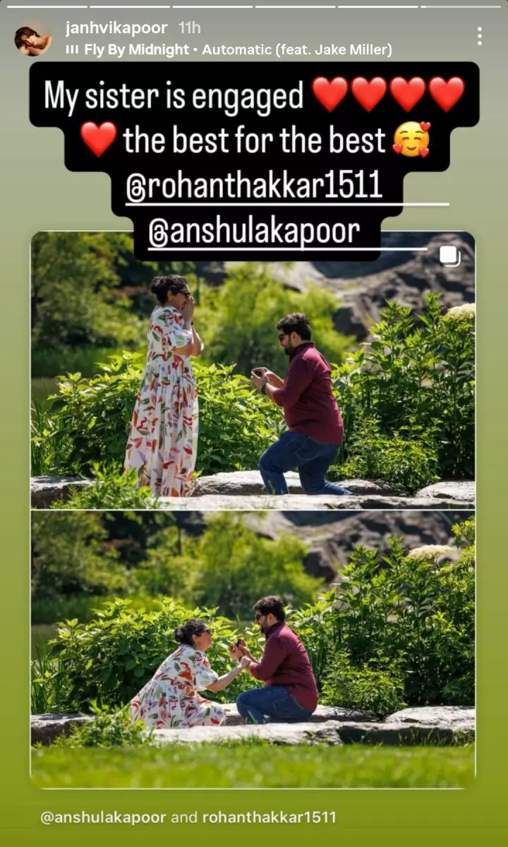 बता दें कि सगाई की इस खूबसूरत खबर पर सबसे प्यारे अंशुला की बहनों ने प्रतिक्रिया दी है। जान्हवी कपूर ने अपनी इंस्टा स्टोरी में लिखा, “मेरी बहन की सगाई हो गई है सबसे अच्छे के लिए सबसे अच्छा!”