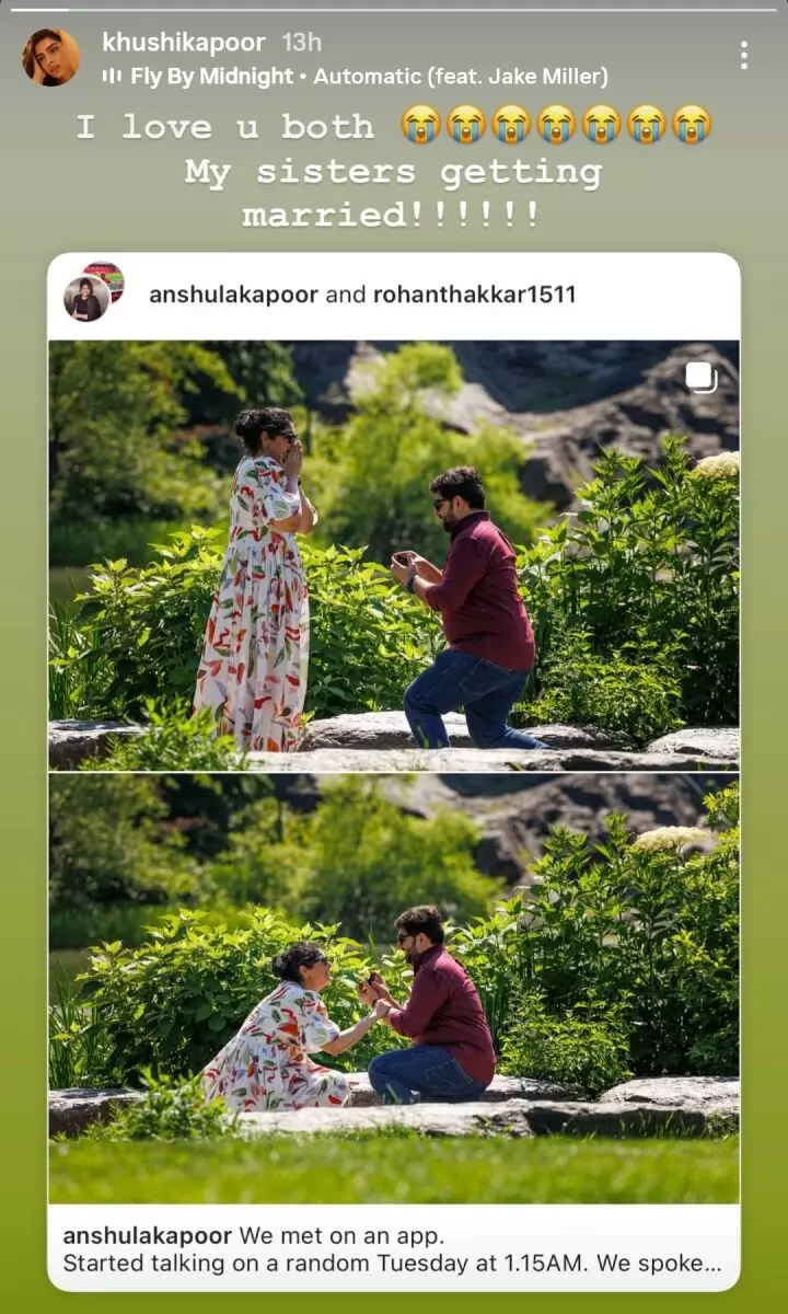 अंशुला ने बताया कि दोनों की मुलाकात एक ऐप पर हुई थी और पहली बार बातचीत रात 1:15 बजे शुरू हुई थी। तीन साल बाद, न्यूयॉर्क के सेंट्रल पार्क में उसी समय पर रोहन ने उन्हें प्रपोज़ किया। अंशुला ने लिखा, "मैं कभी परियों की कहानियों में यकीन नहीं करती थी… लेकिन उस दिन जो हुआ, वो जादू जैसा था। बहुत ही शांत और सुकून देने वाला प्यार – जो घर जैसा महसूस होता है।"