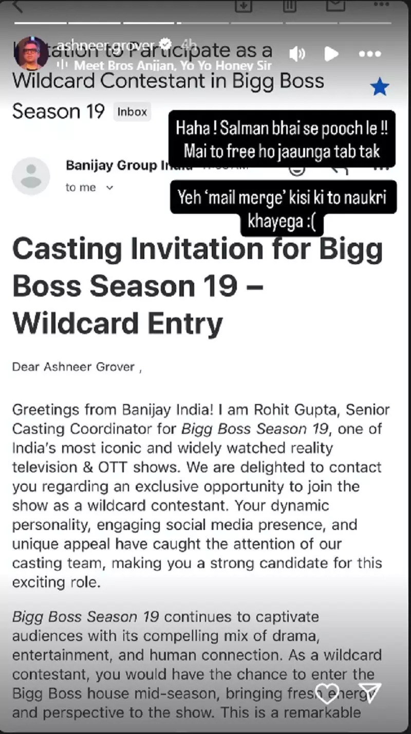 अशनीर ग्रोवर ने शुक्रवार (26 सितंबर) को सोशल मीडिया पर एक स्क्रीनशॉट शेयर किया, जिसमें बिग बॉस टीम की ओर से उन्हें भेजा गया ईमेल नजर आ रहा है। ईमेल पर बिग बॉस 19 के सीनियर कास्टिंग कोऑर्डिनेटर का जिक्र है। मेल में अशनीर को शो के मिड-सीजन में बतौर वाइल्ड कार्ड हिस्सा लेने की बत कही गई है जो शो को नई दिशा देने के लिए है।