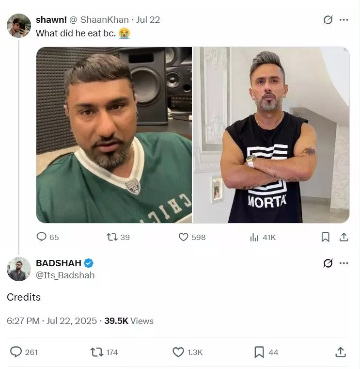 23 जुलाई को एक सोशल मीडिया यूजर ने एक्स पर हनी सिंह की हाल की तस्वीरें शेयर कीं। इस फोटो में उनकी फिटनेस में आए बदलाव की तारीफ की गई। पोस्ट में लिखा था, "उन्होंने ऐसा क्या खाया" इस पर बादशाह ने तीखे अंदाज में सिर्फ एक शब्द में जवाब दिया – “Credits (क्रेडिट्स)।”