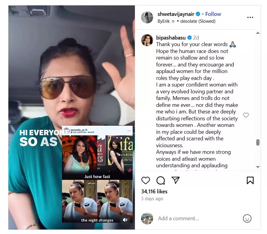 बिपाशा बसु ने इंस्टाग्राम पर एक रील के कमेंट सेक्शन में अपनी प्रतिक्रिया दी, जिसमें महिलाओं, खासकर नई मांओं पर समाज द्वारा थोपे गए सौंदर्य मानकों और दबावों की आलोचना की गई थी। यह रील पूर्व मिस इंडिया और ब्यूटी इंफ्लुएंसर श्वेता विजय नायर ने बनाई थी, जिसमें बिपाशा की पहले और अब की तस्वीरों का कोलाज दिखाया गया था।