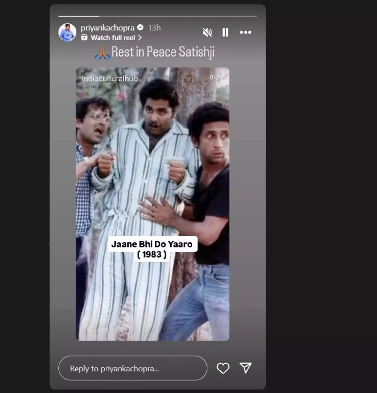 प्रियंका चोपड़ा ने अपनी इंस्टाग्राम स्टोरीज पर इंडिया कल्चरल हब द्वारा साझा की गई एक पोस्ट को फिर से साझा करते हुए लिखा, "नमस्ते, सतीश जी।"