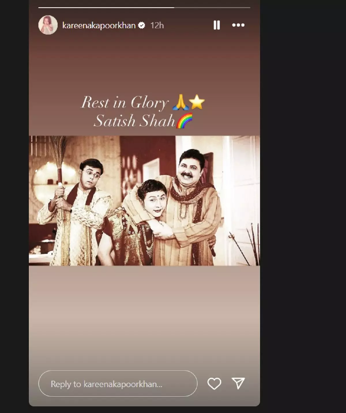 करीना कपूर ने सतीश शाह के "साराभाई vs साराभाई" शो की एक तस्वीर साझा की, जिसमें सुमीत राघवन और राजेश कुमार भी थे। उन्होंने लिखा, "ग्लोरी में विश्राम करो (नमस्ते और स्टार इमोजी) सतीश शाह (इंद्रधनुष इमोजी)।"