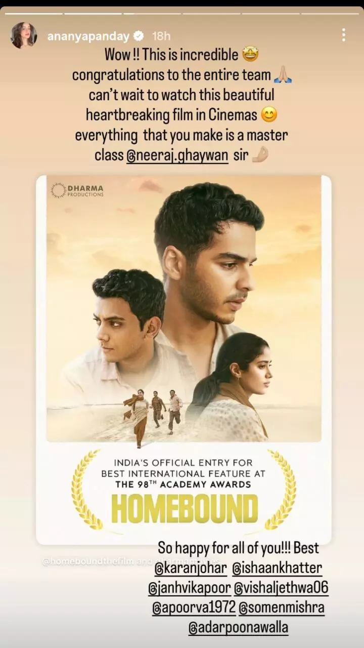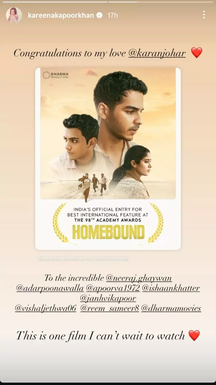 Homebound: 2026 के अकादमी पुरस्कारों के लिए भारत की आधिकारिक प्रविष्टि ‘होमबाउंड’ बनते ही बॉलीवुड में उत्साह की लहर दौड़ गई है। फिल्म की घोषणा के बाद सोशल मीडिया पर सितारों और फैंस की प्रतिक्रिया जोरदार रही। करीना कपूर, अनन्या पांडे, सारा अली खान, संजय कपूर और कई अन्य कलाकारों ने फिल्म और इसकी टीम को बधाई दी।
