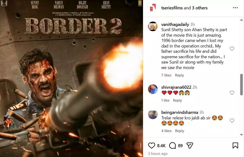 पोस्टर रिलीज़ होते ही सोशल मीडिया पर प्रतिक्रियाओं की बाढ़ आ गई। एक यूज़र ने लिखा, “सुनील शेट्टी के बेटे अहान शेट्टी को फिल्म में देखना गर्व की बात है। 1996 में बॉर्डर रिलीज़ हुई थी जब मैंने अपने पिता को खो दिया था… उन्होंने देश के लिए सर्वोच्च बलिदान दिया था। उस समय हम सभी ने सुनील सर की फिल्म साथ देखी थी।” एक अन्य यूज़र ने लिखा, “जय हिंद!”