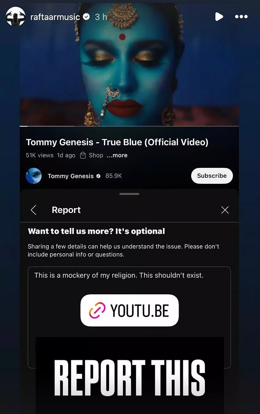 भारतीय रैपर रफ्तार भी इस मामले में खुलकर सामने आए हैं। उन्होंने अपने इंस्टाग्राम स्टोरी के जरिए वीडियो की आलोचना करते हुए लोगों से अपील की कि वे यूट्यूब पर वीडियो को रिपोर्ट करें। रफ्तार ने वीडियो को रिपोर्ट करने का स्क्रीनशॉट भी साझा किया, जिसमें उन्होंने लिखा, "यह मेरे धर्म का मज़ाक है। इसे बंद होना चाहिए।" उन्होंने अपने फॉलोअर्स से भी इस वीडियो को रिपोर्ट करने का आग्रह किया।