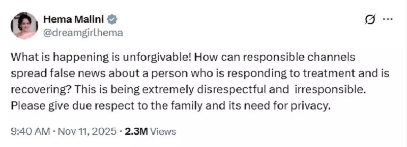धर्मेंद्र की पत्नी व अभिनेत्री हेमा मालिनी ने भी सोशल मीडिया पर लिखा, “जो हो रहा है, वह अस्वीकार्य है! ऐसे व्यक्ति के बारे में झूठी खबरें फैलाना, जो इलाज का जवाब दे रहे हैं और ठीक हो रहे हैं, अत्यंत अनादरपूर्ण और गैर-जिम्मेदाराना है। कृपया परिवार और उनकी प्राइवेसी का सम्मान करें।”