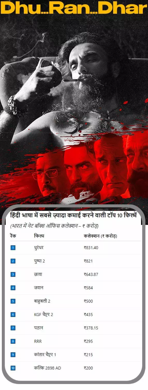 धुरंधर ने रचा इतिहास: भारतीय बॉक्स ऑफिस में कमाए ₹831.40 करोड़, विदेशों में Baahubali 2 के करीब पहुंची