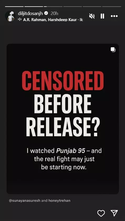 दरअसल, दिलजीत का यह बयान उनकी फिल्म ‘पंजाब 95’ को लेकर है, जो अभी तक भारत में रिलीज नहीं हो पाई है। फिल्म को लेकर केंद्रीय फिल्म प्रमाणन बोर्ड (CBFC) ने 127 कट्स की सिफारिश की थी, जिसे फिल्म के निर्देशक हनी त्रेहान और दिलजीत ने मानने से इनकार कर दिया। इस फिल्म की कहानी मानवाधिकार कार्यकर्ता जसवंत सिंह खालड़ा की जिंदगी पर आधारित है।