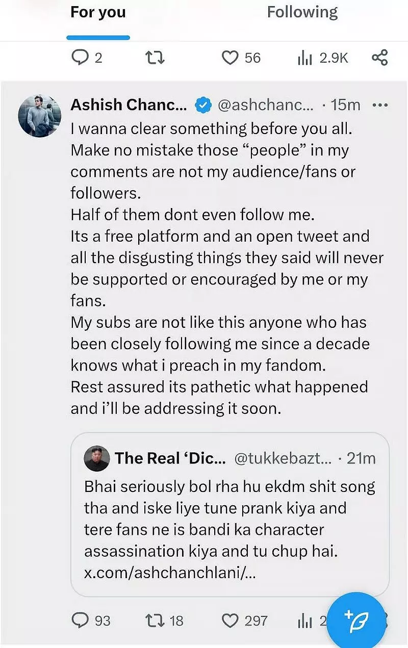 इससे पहले, आशीष ने एली को निशाना बनाने वाले ट्रोल्स पर भी प्रतिक्रिया दी थी। आशीष ने एक ट्रोलर को जवाब देते हुए कहा था- "मैं आप सभी के सामने एक बात स्पष्ट करना चाहता हूं। कोई गलती न करें। मेरे कमेंट्स में जो 'लोग' हैं, वे मेरे दर्शक/फैंस या फ़ॉलोअर नहीं हैं। उनमें से आधे तो मुझे फ़ॉलो भी नहीं करते। यह एक मुफ़्त प्लेटफ़ॉर्म और एक खुला ट्वीट है, और उन्होंने जो भी घिनौनी बातें कहीं हैं, उनका मैं या मेरे प्रशंसक कभी समर्थन या प्रोत्साहन नहीं करेंगे।"