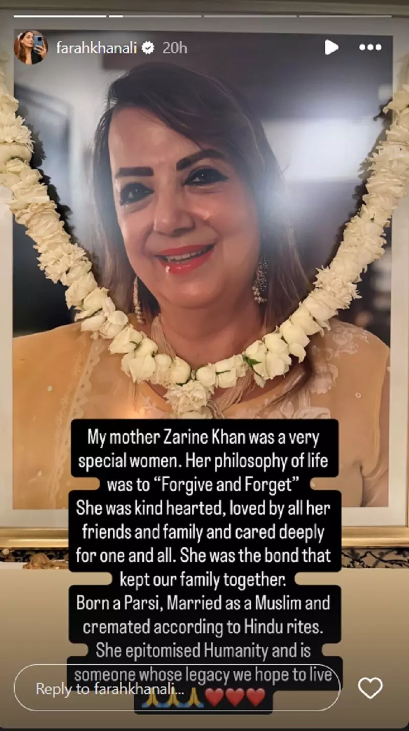 ज़रीन खान के निधन पर बेटी फराह अली खान ने भावुक पोस्ट शेयर किया।