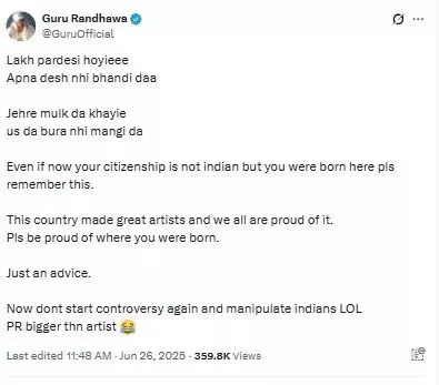 दरअसल, गुरु रंधावा ने हाल ही में एक पोस्ट शेयर करते हुए लिखा, "...चाहे अब आपकी नागरिकता भारतीय न हो, लेकिन आप यहीं पैदा हुए थे। कृपया इसे याद रखें। इस देश ने महान कलाकार बनाए हैं और हमें इस पर गर्व है। जिस मिट्टी में जन्म लिया है, उस पर गर्व करना सीखिए। बस एक सलाह है।"