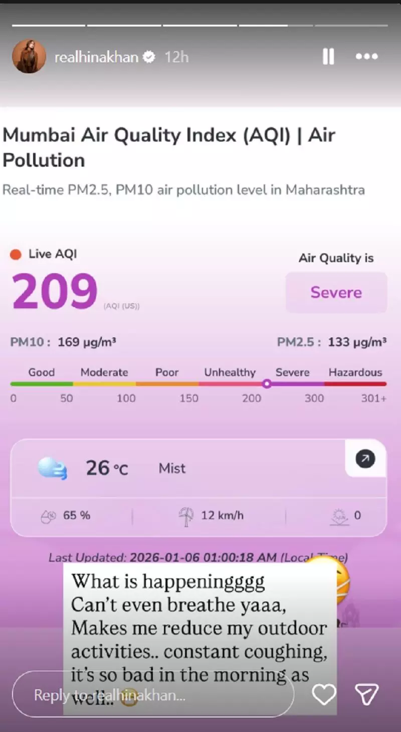 मंगलवार को हिना खान ने अपने इंस्टाग्राम स्टोरी पर मुंबई के खराब एयर क्वालिटी इंडेक्स (AQI) का स्क्रीनशॉट शेयर किया। इसके साथ उन्होंने अपनी परेशानी बताते हुए लिखा कि प्रदूषित हवा के कारण उन्हें घर में ही रहना पड़ रहा है और बाहर निकलना मुश्किल हो गया है।