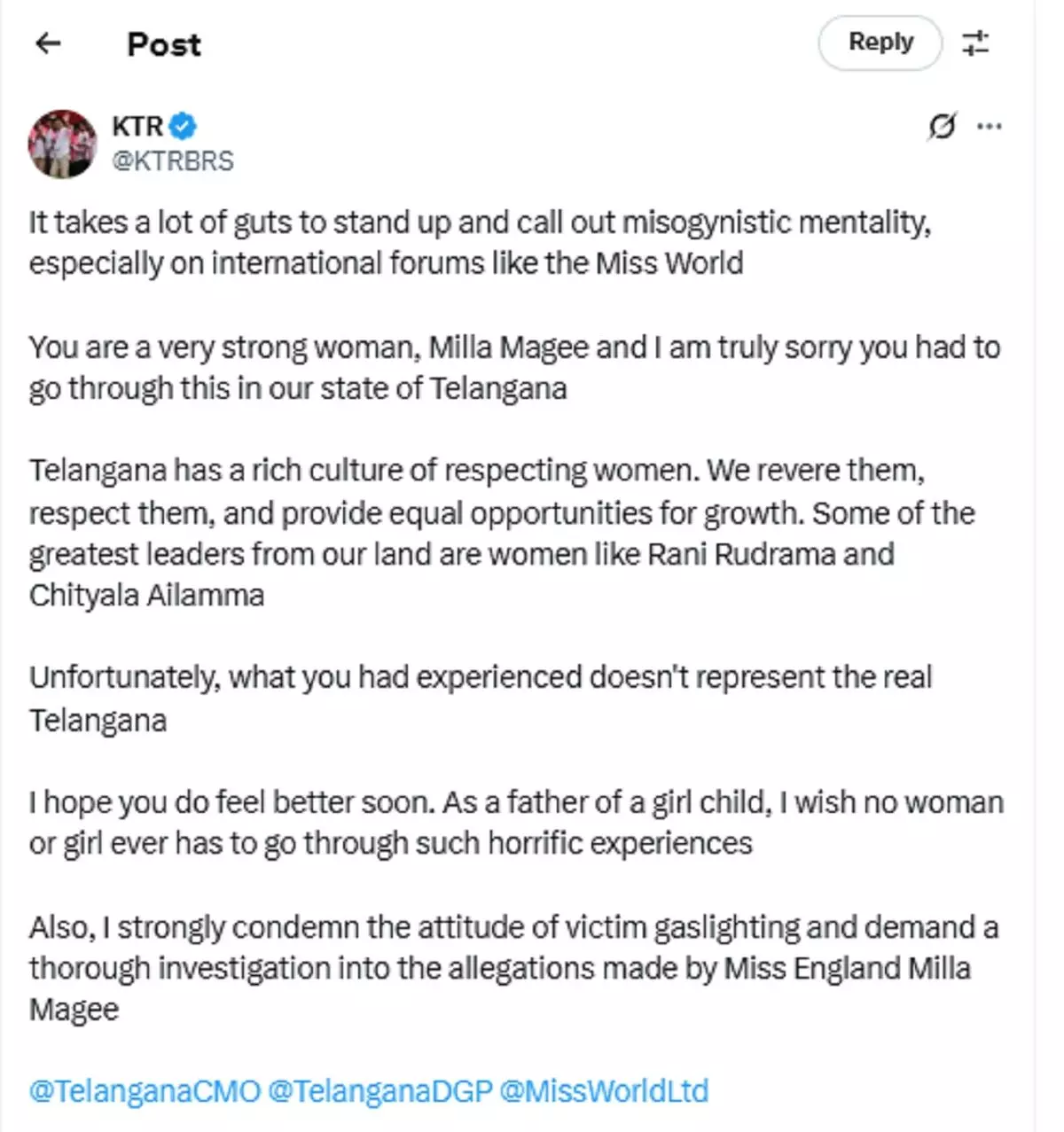 केटीआर ने सोशल मीडिया मंच एक्स पर अपनी प्रतिक्रिया साझा करते हुए लिखा, "मिस वर्ल्ड जैसे अंतरराष्ट्रीय मंच पर महिला विरोधी मानसिकता को उजागर करने का साहस दिखाना काबिल-ए-तारीफ है। मिला मैगी, आप एक मजबूत महिला हैं। हमें खेद है कि आपको तेलंगाना में इस तरह का अनुभव हुआ। तेलंगाना महिलाओं को सम्मान देने की भूमि है—यहां हम रानी रुद्रमा और चित्याला ऐलम्मा जैसी महान महिलाओं को पूजते हैं। आपने जो अनुभव किया वह हमारे राज्य की असली पहचान नहीं है।"