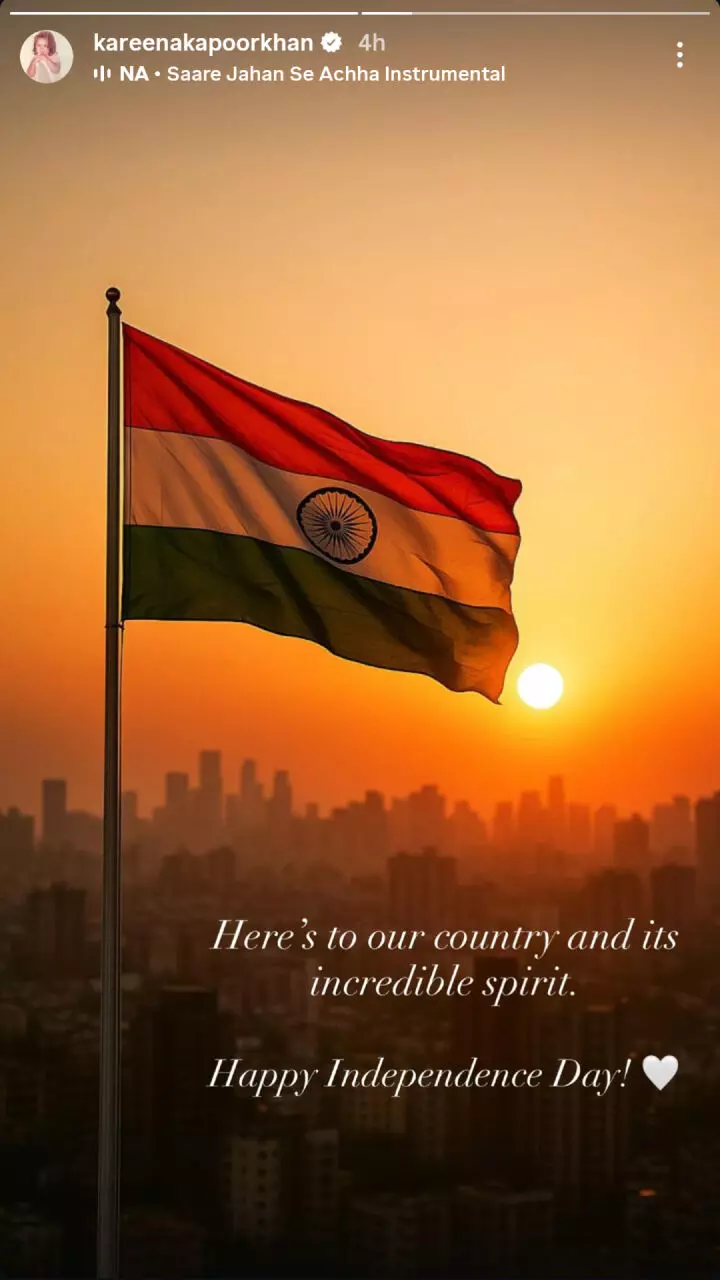 करीना कपूर खान ने इंस्टाग्राम स्टोरीज में तिरंगे की तस्वीर शेयर कर लिखा, "हमारे देश और उसकी शानदार भावना को सलाम। स्वतंत्रता दिवस की शुभकामनाएं।"