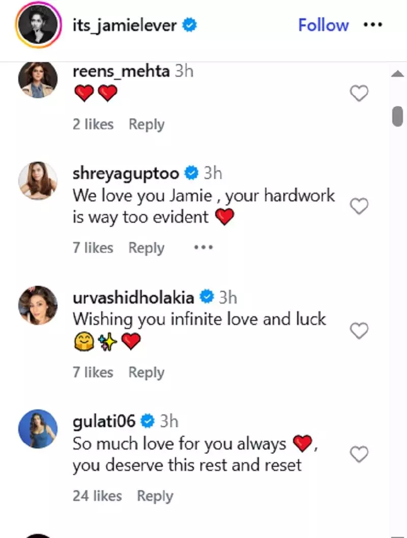 जेमी के पोस्ट पर फैंस ने उन्हें सपोर्ट किया। एक यूज़र ने लिखा, "आप लिमिटेड एडिशन हो। हिम्मत मायने रखती है। सबको रुलाना आता है, लेकिन अपने ऑडियंस को समझकर उन्हें हंसाना सबसे महत्वपूर्ण है। लव यू हमेशा।" एक्ट्रेस पायल गुलाटी, उर्वशी ढोलकिया समेत कई नामी दिग्गजों ने उनका सपोर्ट किया।