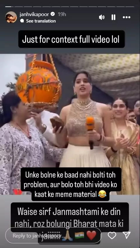 जान्हवी ने कैप्शन में लिखा – “पूरा वीडियो बस कॉन्टेक्स्ट के लिए। अगर उनके बोलने के बाद मैं नहीं बोलती तो दिक्कत, और बोलूं तो वीडियो काटकर मीम बना दिया जाता है। वैसे सिर्फ जन्माष्टमी के दिन नहीं, मैं रोज़ कहूंगी भारत माता की जय।”